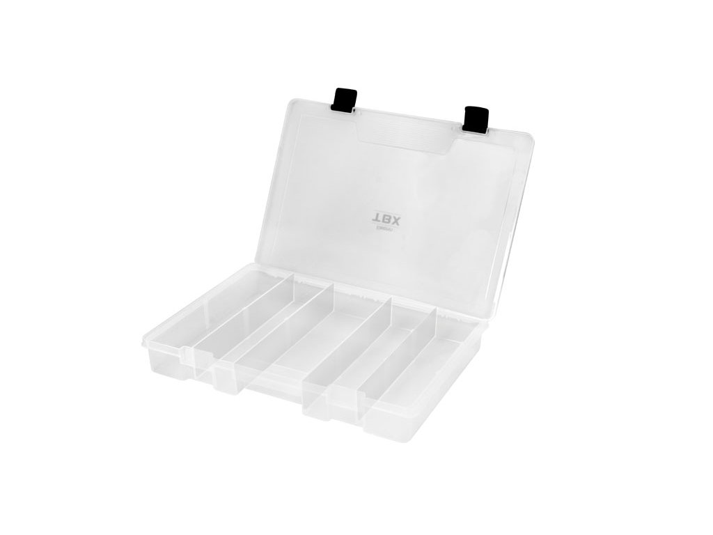 TBX ONE Clip je rada multifunkčných krabičiek určených na uloženie rybárskeho príslušenstva. Vyrobená je z transparentného plastu, takže máte vždy prehľad o uložených veciach vo vnútri krabičky. Vybavená je praktickými externými klipmi z plastu. Technické parametre: Rozmer: 350x250x48mm Počet pevných priehradiek: 5 Rozmer priehradky: 1x(8,5x21,5x4,2cm), 4x(22,5x6x4,2cm) Počet vkladateľných priečinkov: 5