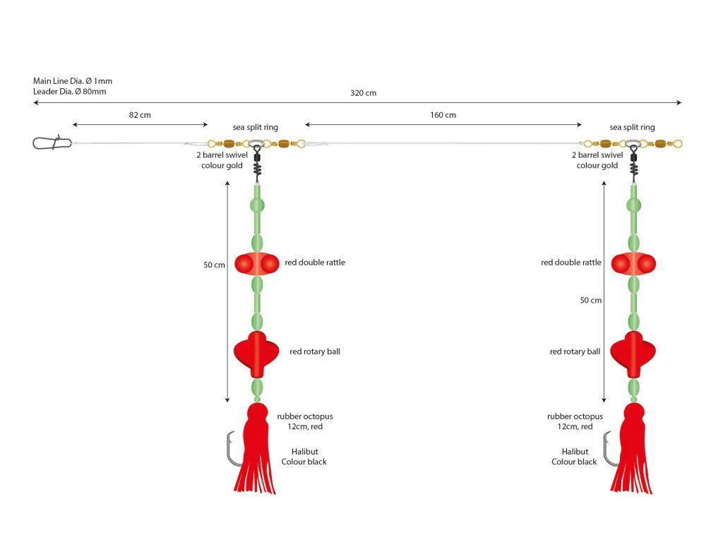 Sestava pro lov tresek se zaoblenými háčky pro samozásek. Určena pro velké hloubky 50 - 300 m, ideálně lehce nade dnem. Rotující křídélka lákají mníky a tresky.
