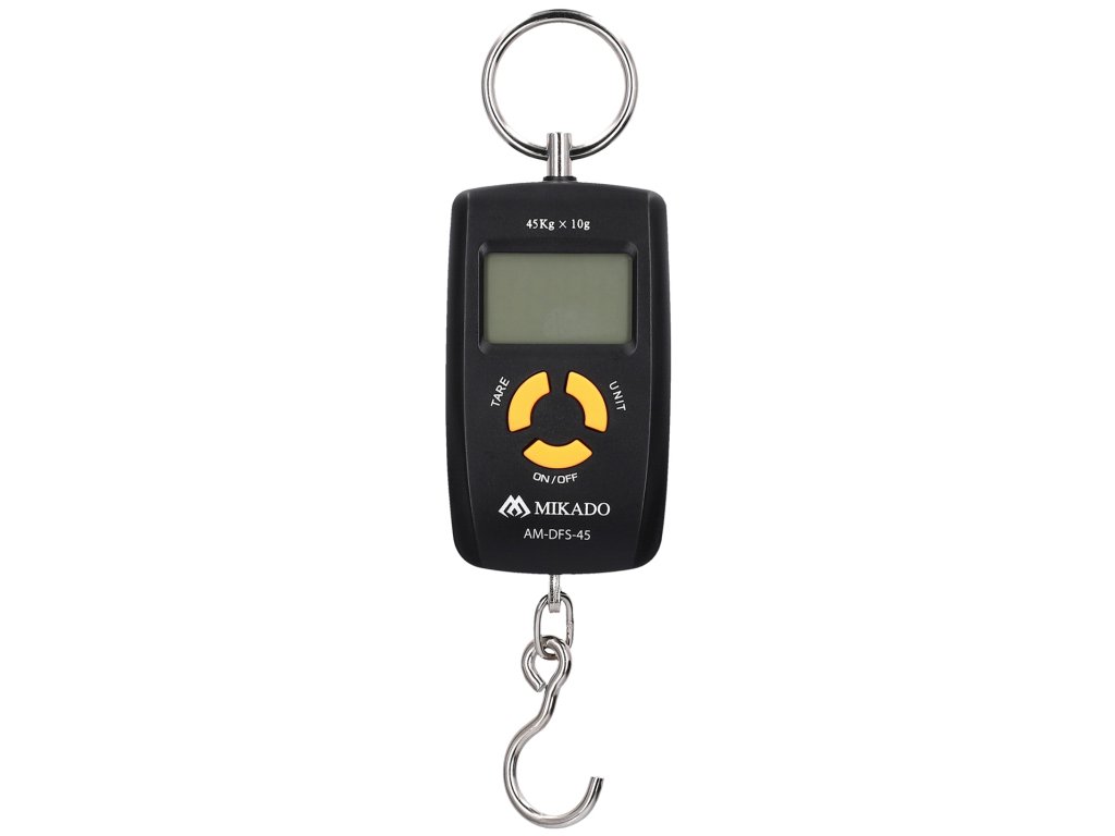Elektronická váha na vážení úlovků s funkcí tarování, změnou jednotek a maximální kapacitou 40 kg.